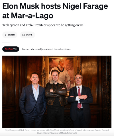 We’ve been trying to tell the whole story via a new podcast “Sergei and the Westminster Spy Ring”. We are ready to publish but the legal protections we need keep getting more and more expensive. I’ve spent the last several weeks trying to make sure the team is protected from litigious individuals - and just as the news about Musk ‘coming in with the money” behind Farage breaks. This is all part of the same picture - democracy for sale!