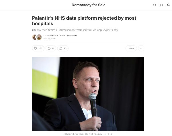 This is happening alongside an attempt at data centralisation in the NHS that is being overseen by the infamous American tech firm, Palantir. Palantir offered a £1 contract to the UK government to provide data infrastructure to enable vaccination rollout during the 2020 Covid pandemic. It then went on to bag the £300 million Federated Data Services contract, giving it access to one of the most valuable healthcare databases in the world.