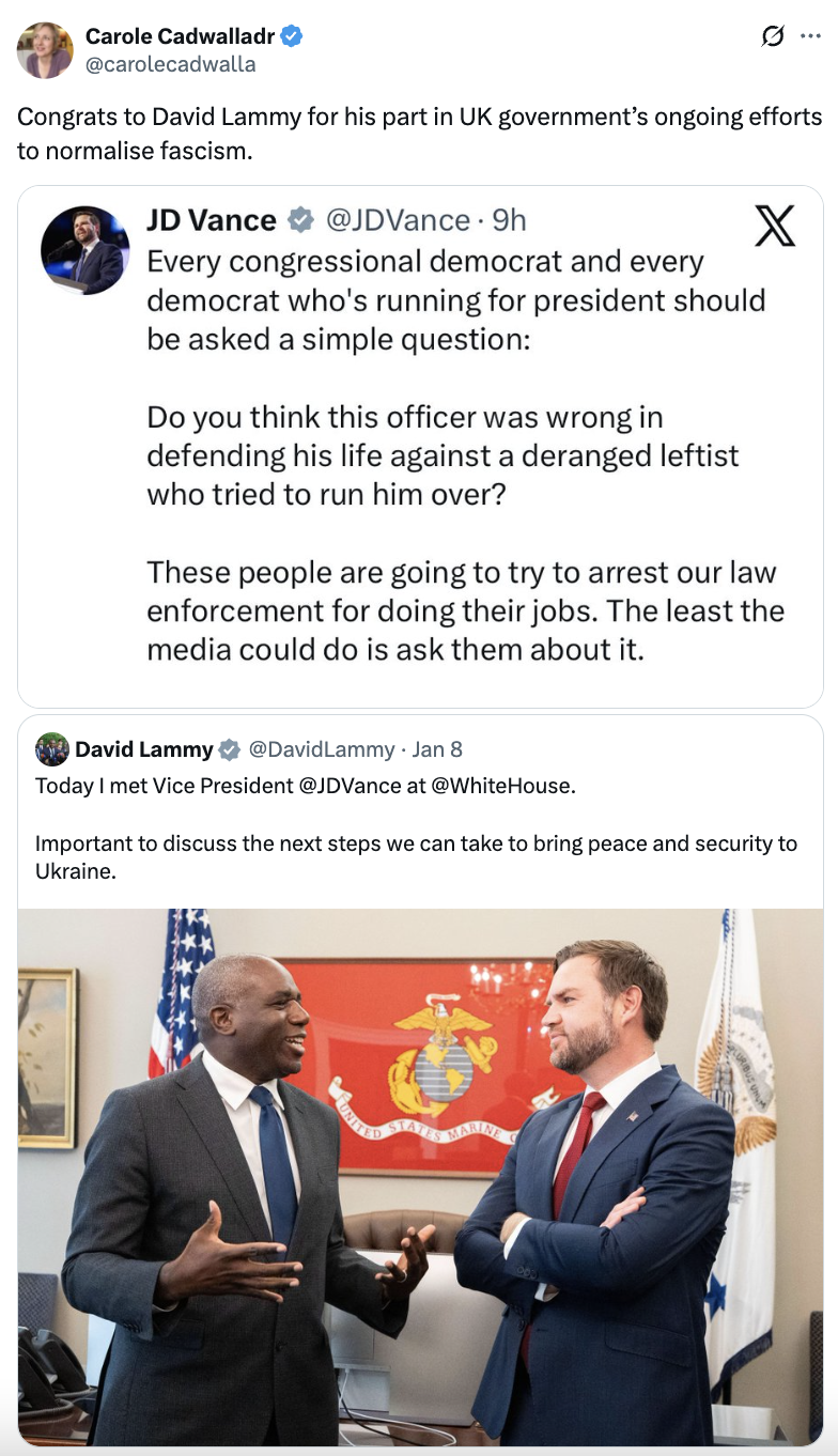 The most basic norms of the post-war order are openly flouted - and the response of the UK Prime Minister is, well, not to respond at all. While Trump and Starmer’s deputies Vance and Lammy enjoy a nice bit of dinner, and Macron postpones a meeting of the G7 reportedly to accommodate Trump’s 80th Birthday Cage Fight (CAGE FIGHT!?), the signal is clear: power is being indulged, not checked.